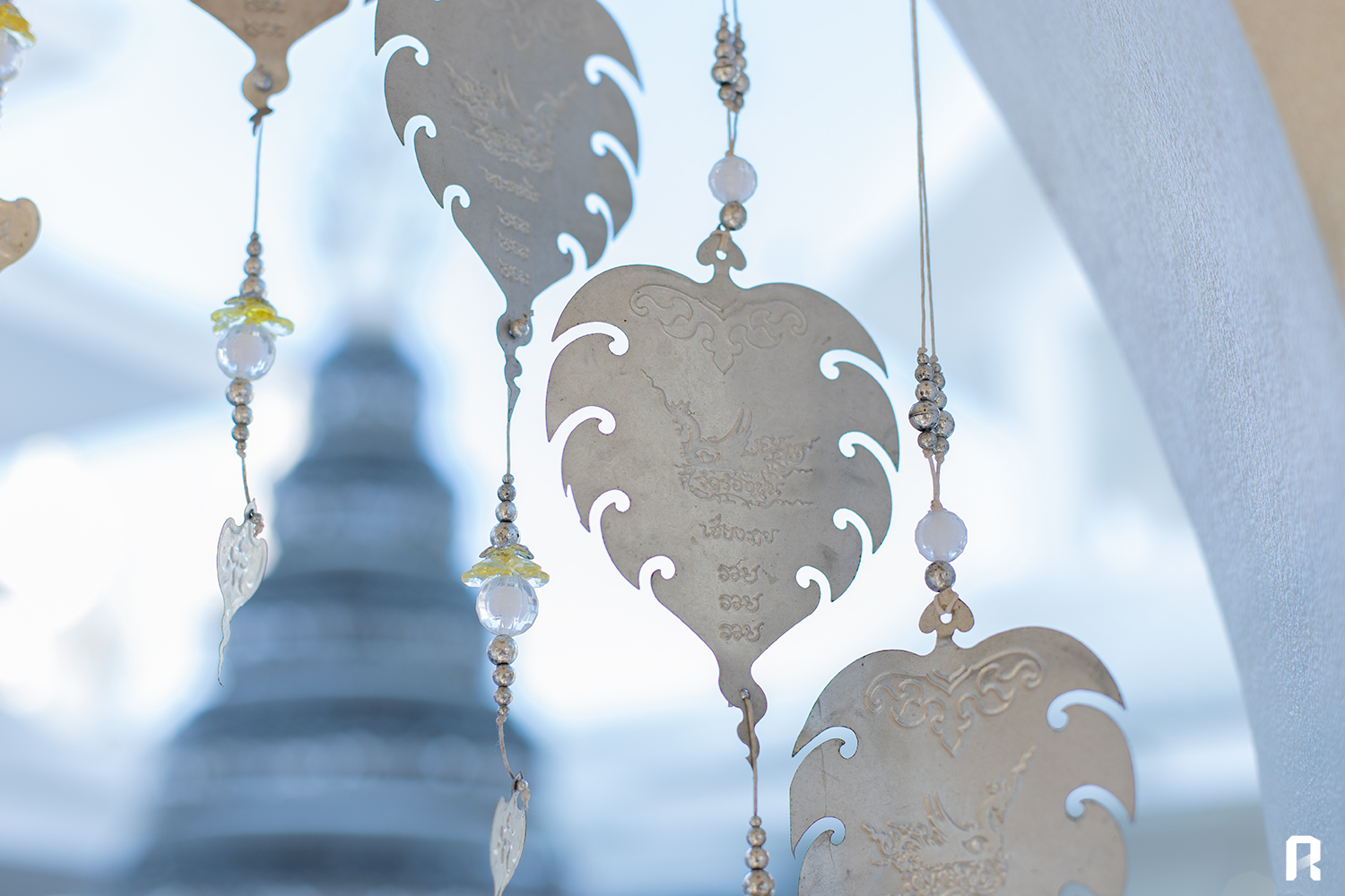 พระอุโบสถสีขาว ปูนปั้นลายไทยสไตล์ลายเส้นที่เป็นเอกลักษณ์ ประดับด้วยกระจก
