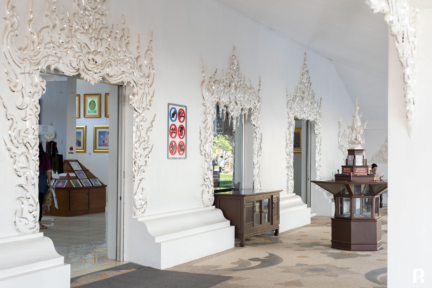 เดินผ่านห้องน้ำสีทอง และ ศาลาอเนกประสงค์ซึ่งเป็นจุดจัดพิธีการต่างๆ และ แสดงผลงานศิลปะบางส่วน